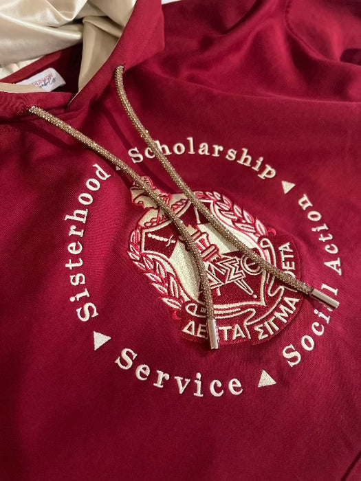 This French Terry oversized crimson hoodie, adorned with our beloved embroidered Sorority Crest and founding principles, is sure to make you stand out.
