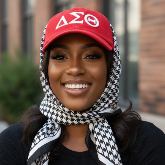 Show your sorority pride with our fashionable and practical satin-lined baseball hat.